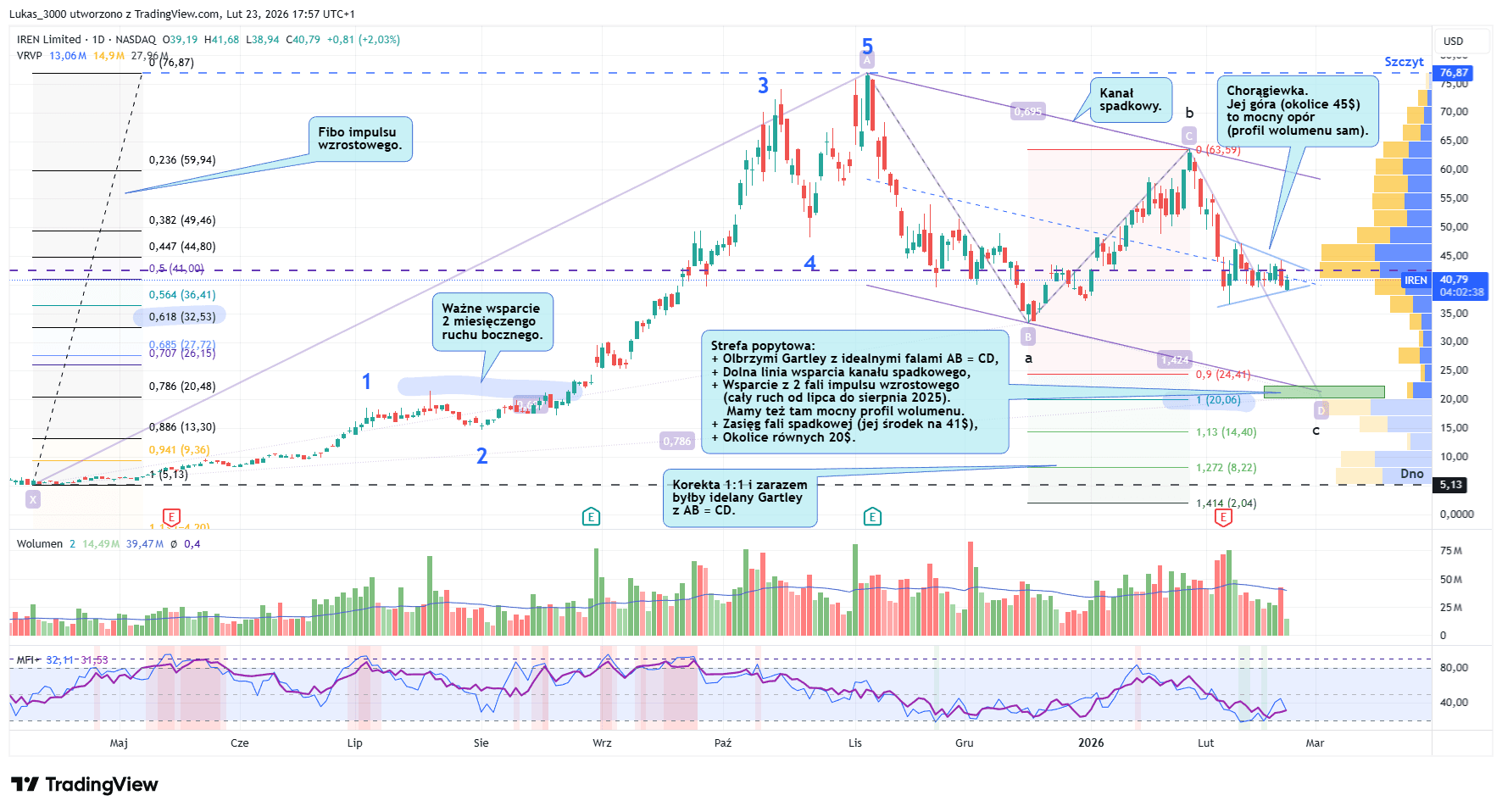 Trakcja wzrostowo już wygląda, ale póki nie wybite okolice równych 4 złotych spróbuję to złapać jeszcze pod Korektę Nieregularną. Pokrywa się ona z lokalnym poziomem 0,618 Fibonacciego. Daje to nam spadek w okolice 3,82 zł.